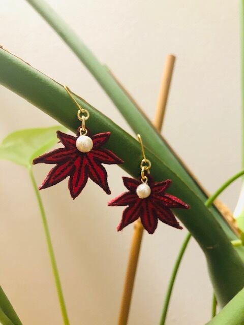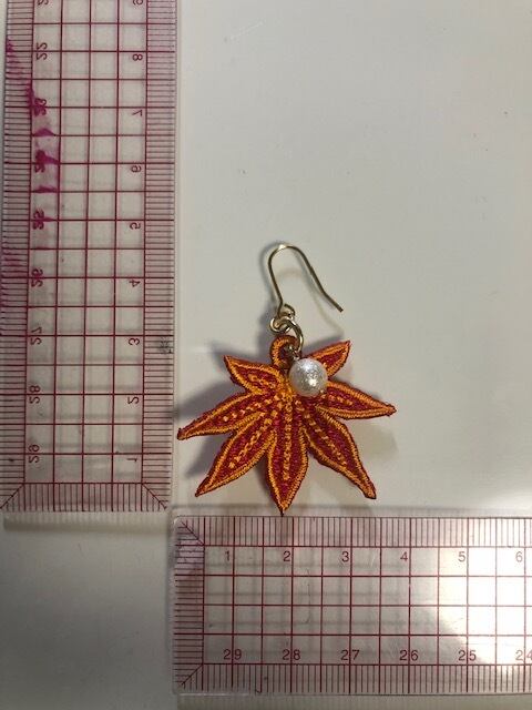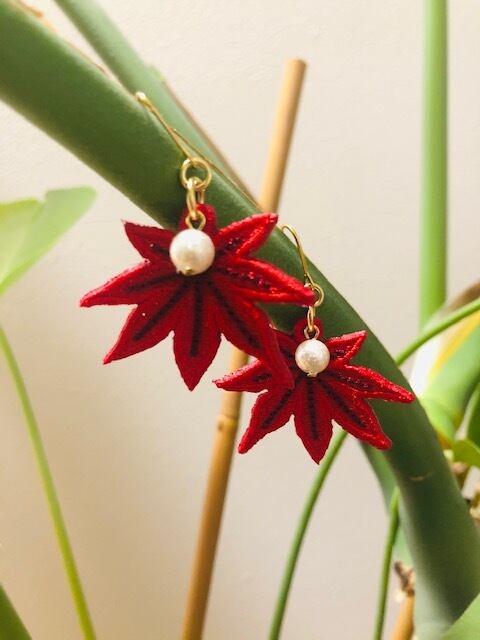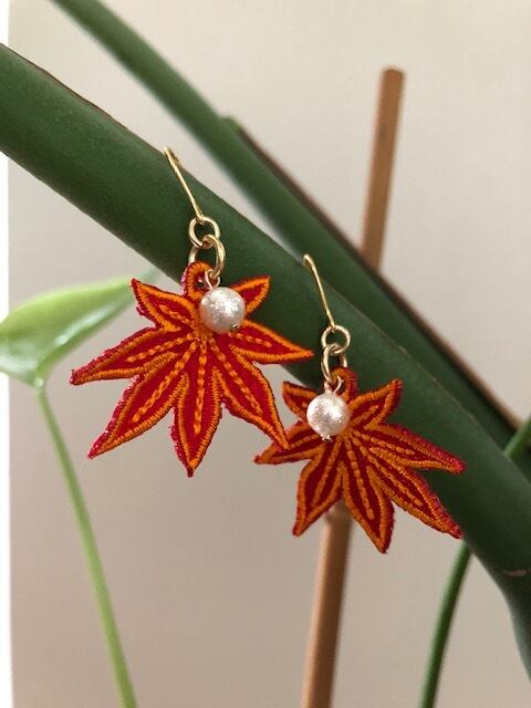 モミジの紅葉をモチーフに ワッペン素材のピアス タテ3.0㎝(金具下)×ヨコ4.0㎝ ※イヤリング金具に変更可能 ※円ワイヤーに変更可能