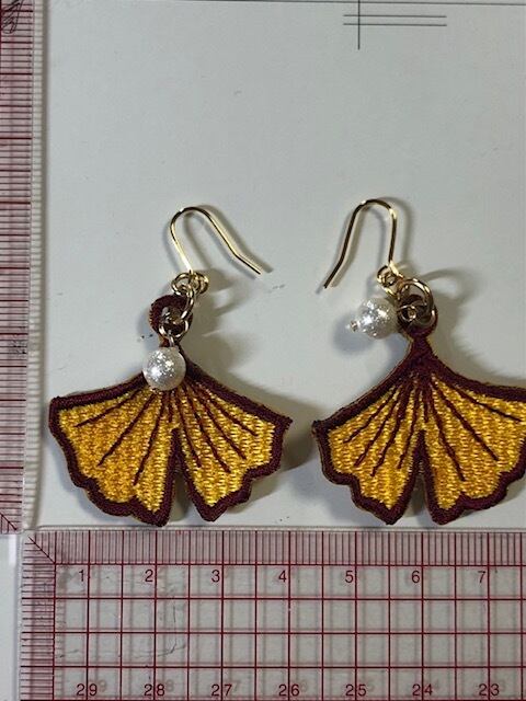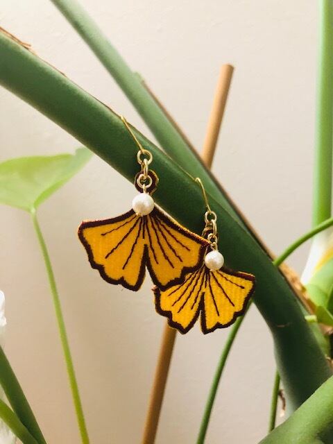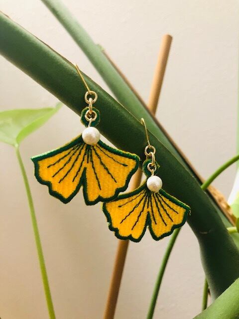 イチョウの紅葉をモチーフに ワッペン素材のピアス タテ3.7㎝(金具下)×ヨコ4.0㎝ ※イヤリング金具に変更可能 ※円ワイヤーに変更可能